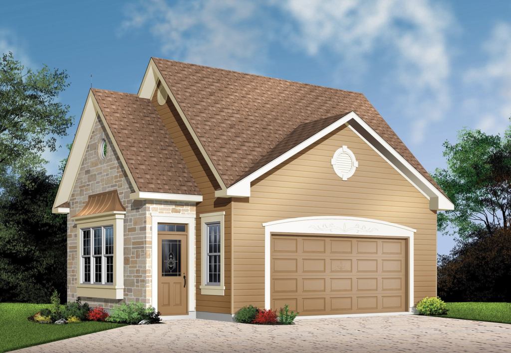 With siding exterior reminiscent of a country barn, the apartment above the three-car garage would be perfect temporary quarters during construction of a permanent home. Later it could function as an in-law unit, nanny quarters, college student apartment, and so on. This design features an eat-in kitchen, a spacious family room, a bathroom, and a bedroom with a roomy closet. The laundry appliances are tucked beneath the stairs on the garage level with an optional laundry chute on the living level. For more images, information, and the floor plan, click here.