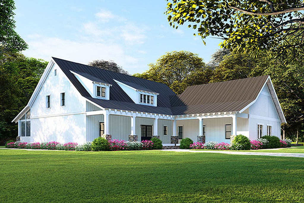A very open layout puts the emphasis on the kitchen, where a large island can seat five people. Within eyesight, a corner fireplace warms up the great room, which flows into the open dining area and out to a large screened porch. The master suite boasts double sinks and walk-in closets. Sleek styling makes the modern farmhouse exterior stand out. See more images, information, and the floor plans.