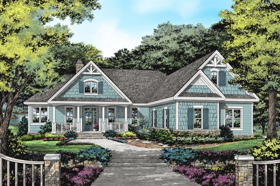 It’s all about relaxing times on the porch of this versatile design, which would work well as a primary residence or vacation getaway. The main floor features the master suite and an extra suite, ideal for hosting in-laws or special visitors. Two more bedrooms upstairs add extra space for kids or friends. See more images, information, and the floor plans.