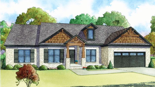 With handsome curb appeal and an open layout, this one-story home stands out. Tapered columns and decorative trusses adorn the exterior. Inside, the open layout encourages mingling around the kitchen’s snack bar, with the breakfast nook letting in light through a bay window. A gas fireplace warms up the great room. On the right side of the home, the master suite enjoys access to the back porch, plus two walk-in closets and a private bathroom with a whirlpool tub. Three more bedrooms (one can become a study instead) share a hall bath that boasts dual sinks. Extra storage in the garage comes in handy for stashing holiday decorations. See more images, information, and the floor plan.