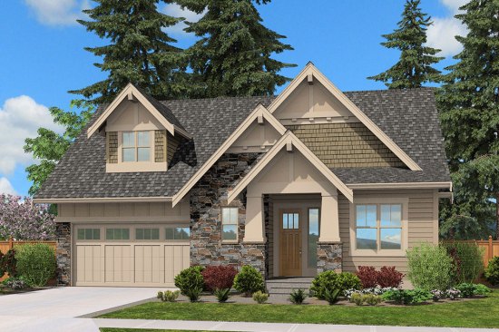 This brand-new design brings style and versatility to a not-huge lot, making it more affordable to build. A fourth bedroom on the main floor can be used as a guest space or a home office. Check out the workshop in the garage. See more images, information, and the floor plans.
