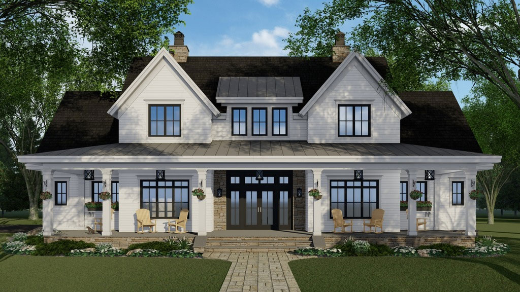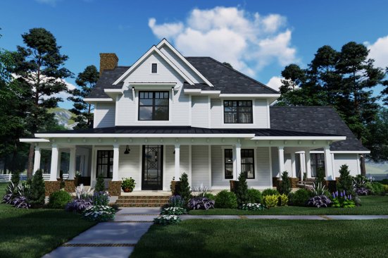 It’s all about relaxing on the porch with this lovely modern farmhouse. But which porch? That’s the question, since owners get a huge wraparound porch that goes all the way from the front to both sides, and then a terrace/barbecue porch in back with a chic fireplace for outdoor fun. See more images, information, and the floor plans.