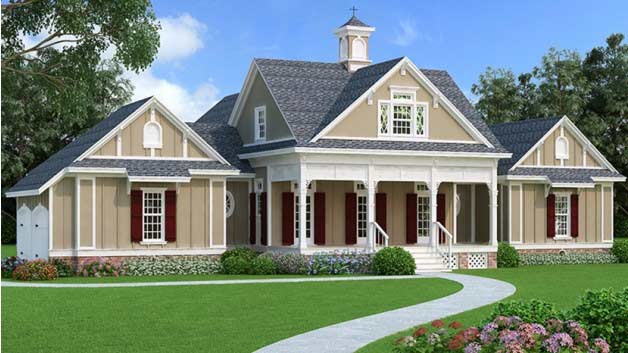 Elegant yet open, this home exudes country charm. Porches in front and back create more living space outdoors. Inside, the kitchen features a large island with a cooktop and snack bar. Built-in storage here and in the nearby living room keeps a household organized. Easy to reach on this level, the master suite displays two walk-in closets, double sinks, a separate shower and tub, and close proximity to the deck. Two more bedrooms share a bathroom and the library space upstairs. Designed for accessibility, all the interior and exterior doors are three feet wide. See more images, information, and the floor plan.