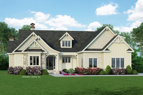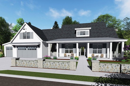 This modern farmhouse gives you options. Choose a crawlspace or slab foundation to get a patio with a fireplace in back, or opt for a walkout basement (a daylight basement is also available) to accommodate a sloping lot with a porch above and a patio below. The open layout feels fresh and contemporary. See more images, information, and the floor plans.