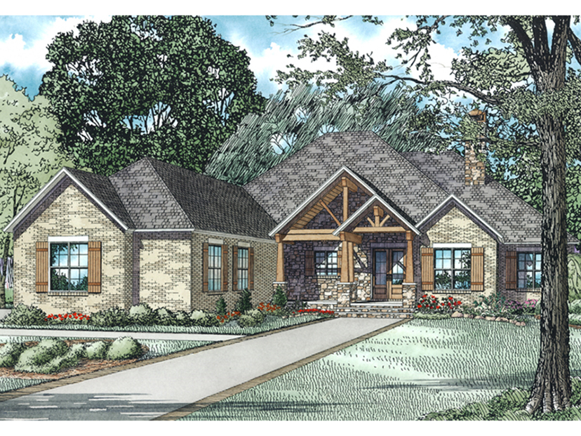 This beautiful brick-and-stone rustic home features a striking timber-beam gabled front porch and an open floor plan. The great room impresses visitors with its high 12-foot ceiling and openness to the spacious kitchen. After eating in the open dining room, head out to the screened porch or enjoy cool evenings by the fireplace on the grilling porch. The kitchen offers a prep island as well as plenty of counter space and a peninsula bar. The master suite displays a gas fireplace and multiple windows for natural lighting while the bath boasts a corner whirlpool tub, a glass shower, dual vanities, and a huge walk-in closet that doubles as a safe room. Two more bedrooms share a bathroom on the right side of the house. Don’t miss the versatile study/media room. See more images, information, and the floor plan.