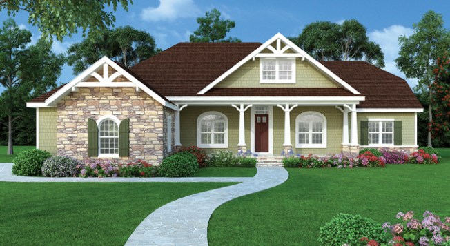 At just under 2,500 square feet, this attractive Craftsman home provides plenty of space for a family. The impressive open plan features a family room with a two-sided fireplace (the other side warms the dining room), a decorative tray ceiling, and a large window looking out to the rear porch and patio (where you’ll find another fireplace for chilly evenings). A large island takes center stage in the kitchen, giving plenty of counter space and room for casual meals. On the way in from the garage, the utility zone keeps everything organized with room for keys and coats. The large master suite offers a luxurious master bath, a sunny sitting area, and a lovely tray ceiling. Two additional bedrooms feature walk-in closets and a Jack and Jill bath with private dressing/vanity areas. The angled three-car garage sets one of the bays back a bit to keep the beautiful exterior balanced. See more images, information, and the floor plan.