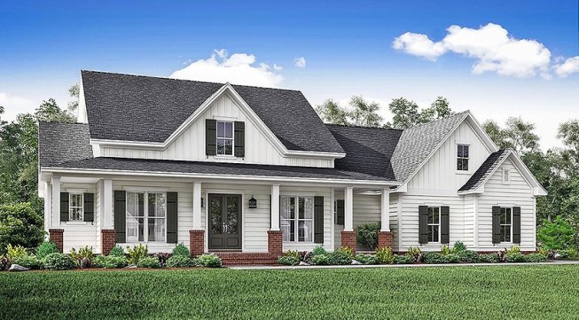 With a wraparound porch in front and another spacious outdoor living area in back, this home is ready for summer parties. The inside presents an open-concept layout with a snack bar at the kitchen for relaxed entertaining. Two sets of French doors open the great room to the rear porch. On the left side of the home, a flex space can become a playroom, office, craft space, or just about anything else. The master suite invites you to relax in its deluxe bathroom. Doing laundry becomes easy with the owner’s closet opening directly to the utility room. See more images, information, and the floor plan.