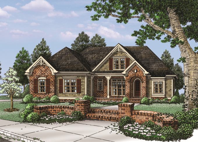 With down-home style and Colonial Revival detailing, this home is sure to be the talk of the neighborhood. Inside, an elongated foyer leads to a vaulted family room, complete with decorative columns and a centerpiece fireplace. Separated for privacy, the master bedroom delights with a tray ceiling, window seat, and a walk-in wardrobe with a separate linen closet. Two family bedrooms are located on the right side of the plan and share a full hall bath. See more images, information, and the floor plan.