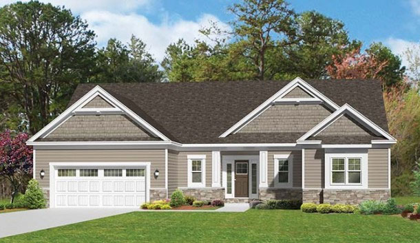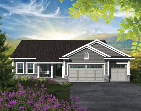 A pleasing blend of shake shingle, stone, and siding give this ranch-style home welcoming curb appeal. With a centrally located kitchen island in the open-concept living area, the design is a natural for entertaining. The covered porch off the great room is the perfect place for sitting and enjoying the sunset. The master suite’s spacious-but-streamlined bathroom includes two sinks and an extra-large shower; if buyers want a traditional tub, an alternate layout makes room for one. Two walk-in closets provide plenty of clothing storage. See more images, information, and the floor plan.