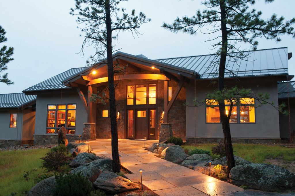 This contemporary Craftsman home centers around its dramatic two-story great room, grand covered porch, and huge view. The smart layout ideally balances privacy and easy socializing, with the master suite located in its own wing on the first floor. Features that facilitate aging in place (as well as making everyday life easier for everyone) include a roll-in shower, a step-free garage, three-foot-wide doors, and the placement of all core spaces on the ground floor. See more images, information, and the floor plan.