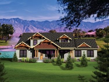 Dramatic yet down-to-earth, this roomy plan features gorgeous timber beams and stone accents on the exterior, with an interior that centers on the spacious great room and kitchen. Windows blanket the back of the house to let light into the hearth-warmed gathering area. To the left, the generous master suite includes a corner whirlpool tub, seated shower, and walk-in closet, with the laundry room conveniently nearby. On the opposite side two family bedrooms share a bath, with the study functioning as another bedroom if needed. See more images, information, and the floor plan.