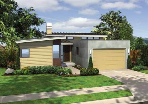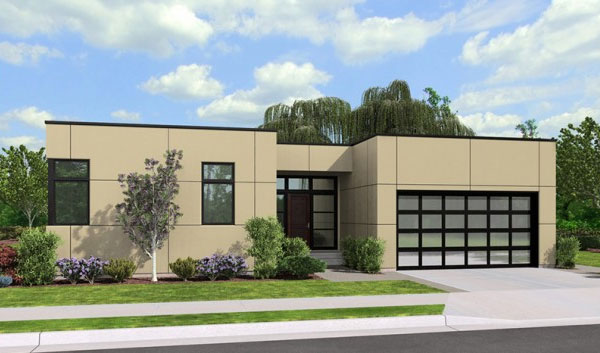 This sleek design features a smart open layout that does a lot with 1,719 square feet. From the foyer, your eye is drawn through the vaulted living room to the disappearing wall of widows in back. The island kitchen easily serves the nearby dining nook, where corner windows let in plenty of sunshine. Sleeping quarters occupy the left wing, with the master suite enjoying privacy (and a modern bathroom with two sinks and a large shower) in back. Bedroom three is well-positioned to serve as an office if needed. See more images, information, and the floor plans.