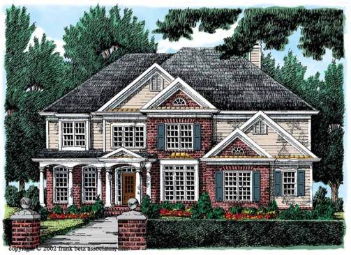 This stately Colonial-influenced home shows off varied rooflines, a grand pediment entry, and eye-catching brick. Inside, the foyer opens on the right to a formal dining room with a box-bay window and reveals a study on the left. The expansive kitchen features an island and a serving bar that overlooks the bayed breakfast nook. A see-through fireplace serves as a focal point in both the sunroom and the two-story family room. The master suite offers a romantic retreat with a bayed sitting area and sumptuous bath with a window seat. See more images, information, and the floor plan.