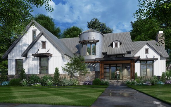 How do you make another modern farmhouse stand out? Give it a cool twist, like the turret on this home’s exterior. Inside, that space holds the staircase, which winds its way upstairs in what’s surely a snap-worthy reveal. See more images, information, and the floor plans.