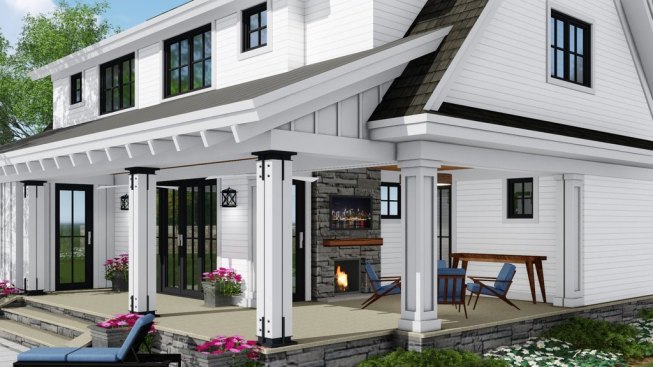 No need for a wide lot to create major atmosphere. Just check out how this fifty-foot-wide farmhouse design incorporates a two-sided fireplace into the layout to striking effect. See more images, information, and the floor plans.
