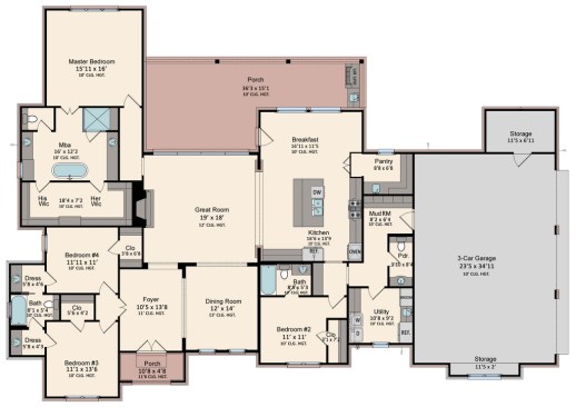 Inside, everything’s on one level, making this a good choice for clients thinking about aging in place. Each bedroom provides a walk-in closet, while the primary suite shows off a spa-like bathroom with two vanities and a showpiece tub. When it’s time to relax together over a meal, homeowners can hang out at the island kitchen, have a seat in the breakfast nook, or head out to the large porch to grill.