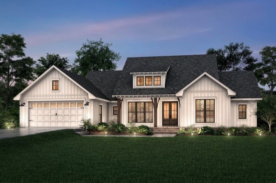 This striking modern farmhouse features an open layout that eliminates the traditional breakfast nook in favor of a clean, relaxed dining space visible from the kitchen. Other highlights of the design include the master suite’s enormous walk-in closet and spa-like bathroom. See more images, information, and the floor plans.