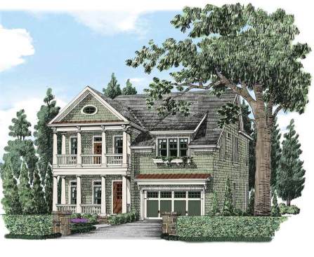 Porches on both levels in front and back take full advantage of a view lot in this upscale family home. A curving island anchors the main level, with fireplaces warming both the elegant grand room and the more intimate keeping room. Decorative columns define the dining room near the front. Upstairs, the master suite offers an ultra-spacious retreat for owners, with highlights including the private porch, the sitting room, and a huge walk-in closet. Bedroom 4 also steps out to a private porch, this one facing the front of the home. Other thoughtful touches include the second-floor location of the laundry room and linen closets for every full bathroom. See more images, information, and the floor plan.