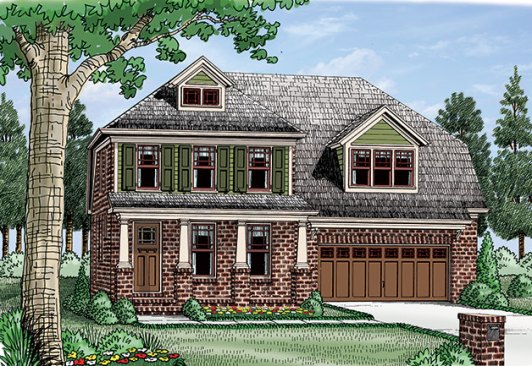 An extra bedroom and full bath on the main floor open up all kinds of possibilities, whether for hosting an elderly relative or providing a place to telecommute. The master suite also resides on this level and treats owners to a walk-in closet, dual sinks, and a separate tub and shower. Two more bedrooms upstairs have use of the large hall bath, where two sinks ensure that no one has to wait to brush his or her teeth. The loft and bonus room up here add more flexibility. Back downstairs, everyone can gather in the open kitchen at the snack bar or nearby in the family room. A covered patio connects to the dining nook. See more images, information, and the floor plan.