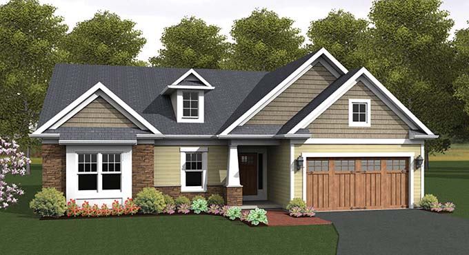 Beautiful brickwork accents the front of this plan, adding to the already-great curb appeal. The split-bedroom layout ensures plenty of privacy for the spacious master suite. Owners will love the large closet, big shower, and dual sinks in here, as well as the easy proximity to the laundry room. The unfinished basement offers an abundance of expansion options as the family grows. Other highlights: walk-in closets for both secondary bedrooms (plus another by the garage), an island in the kitchen, and a patio and porch outside the breakfast nook. See more images, information, and the floor plan.