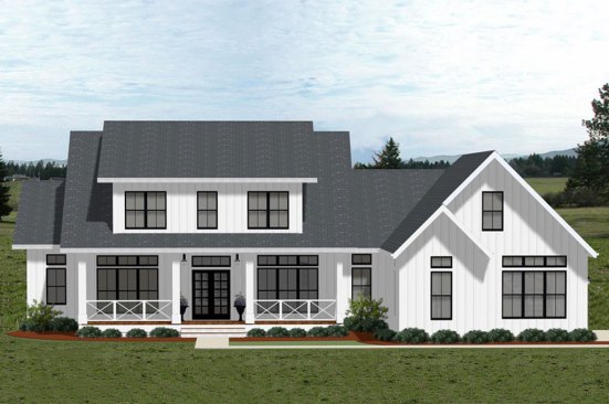 Three of this home’s four bedrooms sit on the main level, so there won’t be a lot of trekking up and down stairs. French doors (two sets of them, actually) open up the vaulted family room to the fireplace-warmed porch in back. Barn doors in the study add extra farmhouse flair to match the sleek exterior. Guests coming? They’ll love the spacious suite and loft upstairs. Unfinished space over the garage adds storage potential. See more images, information, and the floor plans.