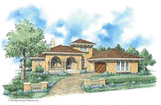 With striking Mediterranean influences, this home invites family and guests to enter under a triplet of arches and a dramatic vaulted portico. Inside, the bayed dining room is to the left and a study resides in the turret, bright with full-length windows. The great room soars with an exposed-beam ceiling and offers a fireplace and three sets of French doors to the veranda. The master suite has an extended-bow window, access to the courtyard and a luxurious bath. An elegant staircase leads to two generous bedrooms; the vaulted bonus room is accessible from garage stairs or the outdoor deck off of Bedroom 3. See more images, information, and the floor plan.