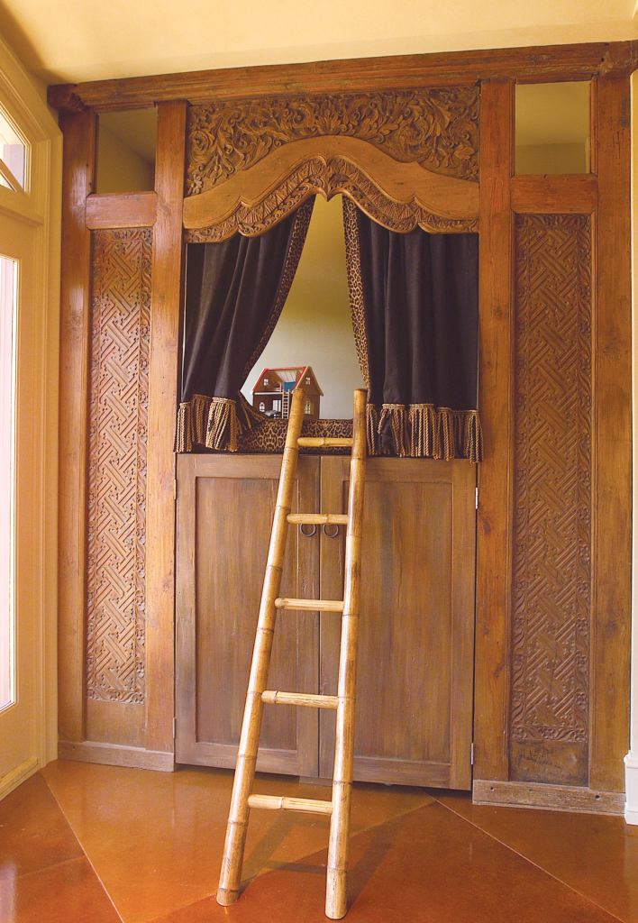 The owners of this Arlington, Texas, house have three children and a passion for traveling, so it is only natural that they included a room in their new home devoted to sparking their kids’ imagination about exotic locales. The client asked builder Michael Wood of Dallas-based Providence Homes to incorporate intricately carved panels found in the Philippines into a tropical-themed activity room. Wood used the shapely panels to transform an alcove into a clandestine hangout. The panels take center stage as an elegant screen for a lofty daybed that’s used as a quiet reading nook as well as a rowdy backstage area. Hanging the curtains behind the elaborate headpiece produces a theatrical effect that motivates the young performers or allows them privacy as they rehearse. Built-in toy storage below the elevated platform is concealed by doors that Wood made to match the mango wood panels. A scored and stained concrete floor stands up to roughhousing while across the room, reed fencing attached to the ceiling echoes the screen’s island charm.