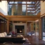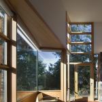 A lower, barnwood-clad volume housing the kitchen and sitting area is more agrarian in character. Its flat roof is covered in native grasses, and its interiors celebrate craft and light, from the stair assembly made of solid cherry, to ample windows that let nature into its sheltering spaces.