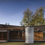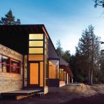 The taller, cedar-clad living, dining, and bedroom bar unspools along the dramatic western exposure, with an office loft above. Its butterfly roof funnels in natural light, and an attached trough sends rainwater runoff to a cistern for watering the plants. Bedrooms have angled bays that gaze out toward the Olympic Mountains.