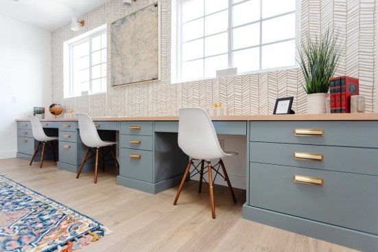 Upstairs, the team completely reorganized the floor and created additional purposeful space. In the home’s loft at the top of the staircase, the team added a study station, where kids have a space away from screens to do homework but are still in close proximity to their bedrooms and a bathroom.