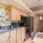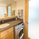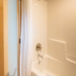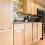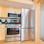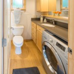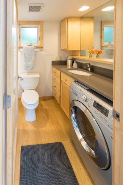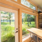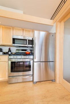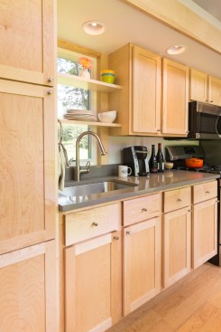 The home is outfitted with building materials and products found in much larger, site-built homes, including Grohe faucets, a Toto toilet, recycled tongue-and-groove Dakota Planking flooring, and an on-demand LP hot water heater. Heating is via baseboard heat, but customers can upgrade to an LG split system A/C with heat pump. The kitchen boasts a 30-inch LP range, 30-inch refrigerator, and plentiful cabinetry.