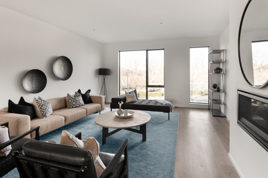 On the townhomes’ second levels, the design team installed 42-inch, linear gas fireplaces with modern glass openings.