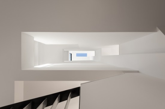Custom, large-format windows along all outward-facing façades open up the ends as much as possible. Plus, on the third floor of every unit, a cathedral-like volume carries up to the upper roofline, with windows and oversized skylights that draw daylight deeper into the spaces.