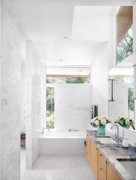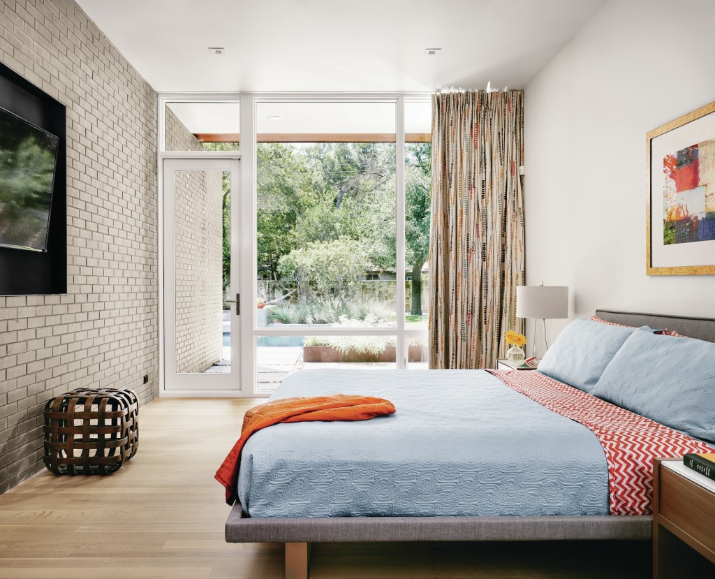 Though the architects avoided using corridors to maximize the overall sense of space, the design bears a planned sensibility that uses brick walls to create distinct spaces without closing off any one room from another. Living and family rooms and the master suite open directly to the backyard, but the children’s bedrooms are designed to be more private, featuring glimpses to the outdoors through clerestory windows that capture views of the trees and allow natural daylight to stream in.