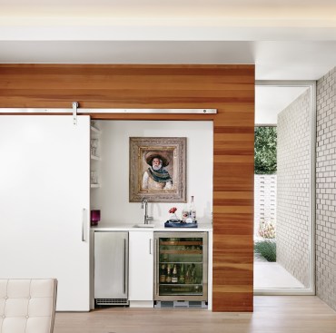 The house’s dramatic 6-foot overhangs, brick walls, plaster ceilings, and oak floors extend from the indoors out. A cedar soffit that breaks free from a stucco plane extending from the interior ceiling adds a sense of lightness. Further midcentury style-inspired details, such as a wall of sliding glass doors and a wet bar concealed behind a sliding barn track, animate the space and provide visual balance by keeping clutter out of sight.