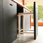 The large island anchoring the main living area conceals seven stools; its recycled rubber cladding is a durable, kid-safe surface.