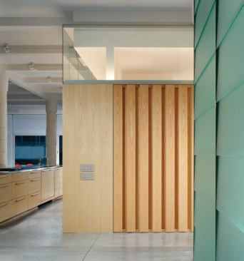 The architects anchored the loft spatially with two wood and glass cores that house the baths and a home office.