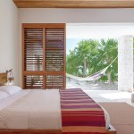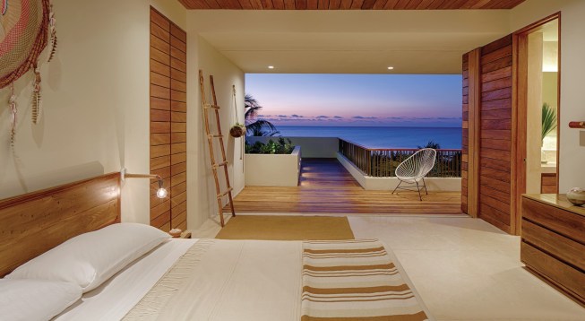 A narrow path brings visitors through the trees to a large living/dining/kitchen space that fully opens to the beach beyond. Two first-floor bedrooms and two above can also be completely exposed to the outdoors. Locally made screened louver doors that slide into the walls offer protection against bugs when needed.