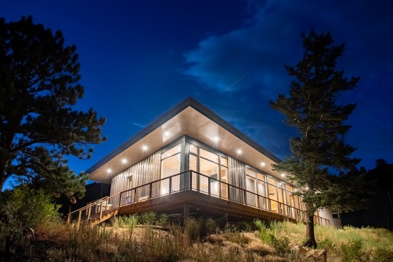 Given the home’s Colorado location, which can experience wildfires to feet of snow, the clients wanted to make sure East Watch lasts well into the future with them. In order to resist the strain of high winds and snow, a steel post-and-beam system was added to support the roof. To mitigate the wildfire danger, the design team chose an exterior material palette of Corten steel, masonry, and glass, with Class A fire-rated thermoplastic polyolefin roofing and ipe decking.