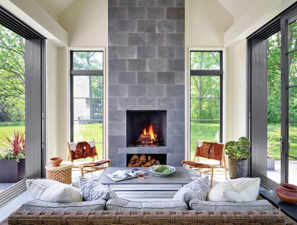 While the kitchen is the initial draw, the heart of this home, just steps away from the kitchen—and neither inside or out by design—is a three-season sunroom outfitted with operable full-height windows and a soaring cathedral ceiling. Designed in a geometric shape, the “jewel box” pavilion allows residents to be outdoors— or feel as though they are—during even the coldest months. Rolling screens allow for summertime use with the doors pulled open, while in-floor radiant heat and a wood-burning fireplace fill the “California room” (as dubbed by the husband) with warmth the remaining months of of the year.