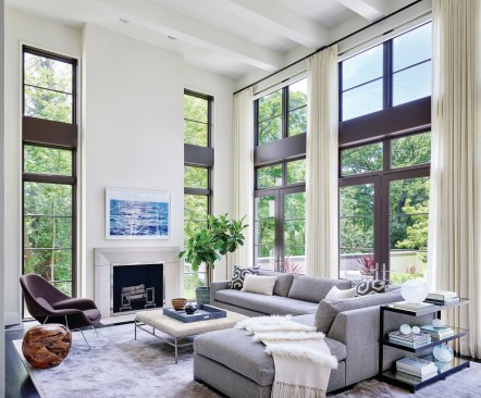 From the foyer, a panelized wood-clad passageway leads to the family room, where the ceiling height nearly doubles and adds a bright, lofty feel to the interiors. The increased height, a paramount request from the clients, challenged the architects to proportionately align the 16-foot-tall ceiling with the upper level, and 9-foot-tall ceilings on this floor.