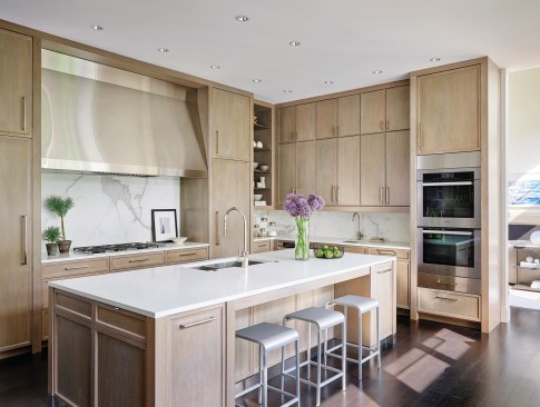 The husband didn’t care for a formal living room, and preferred a casual, relaxing space that could be used as both a home office and retreat for the adults. The wife, who loves to cook, worked meticulously with the architect and designers on designing a kitchen that’s equally functional as it is visually appealing. Canvased in crisp white with custom pale cerused oak cabinets that complement the veined, Calacatta marbled counter surface and backsplash, the thoughtful layout provides a bright and relaxing cooking environment and serves at as a basecamp of sorts for family members, who often begin and end days around the counter.