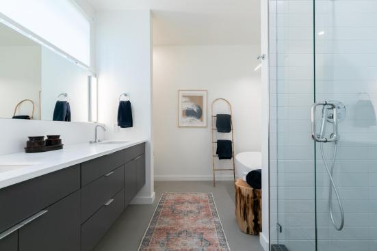 From an architectural standpoint, the 2,193-square-foot Aspenwood dwelling—with a 777-square-foot garage—builds upon the company’s existing Laguna Blanca floor plan. It was designed to be modern and embrace extreme simplicity, an open-concept floor plan, and a blending of indoor living spaces with the outdoors via thoughtfully placed expansive glass.