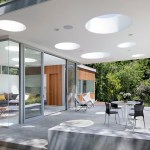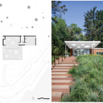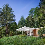 The Mill Valley Guesthouse by San Francisco-based architecture firm Turnbull Griffin Haesloop occupies a steeply sloping lot surrounded by mature cedar and redwood trees. The 640-square-foot space includes a guest room for visiting friends and family, a media room, and a hangout space for teenage children. While the guest room is tucked nearer to the trees, the porch and media room sit on the more open side of the site. A flat patio roof punctuated by round skylights extends the light pattern cast by tree canopies into the porch and indoor spaces.