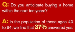 TAKE TWO Another block of research, by Doran Levy and Carol Morgan, principals of Strategic Directions Group of St. Paul, Minn., and authors of 2004’s exhaustive study Marketing to the Mindset of Boomers and Their Elders, finds that for the near term, the next 10 years, 70 percent of the cohort intending to buy a home expect it to be in the same state. Even its most well-off subsets, whom their book terms “Financial Positives” and “Upbeat Enjoyers,” intend to do so at 74 percent and 59 percent rates respectively. The aggregate, they say, portends a much smaller market in the near term than some might expect.