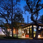 Grable preserved east-facing bedrooms on the high part of the site and added transparent one- and two-story volumes that open up views of the lot’s heritage trees, adjacent flood plain, and downtown San Antonio. The long view became a touchstone for the clients’ dream of a modern, off-the-grid home. “You can see the bell tower of Trinity University, their alma mater,” designed by mid-20th-century architect O’Neil Ford, Grable says. “Here we were among these traditional homes, and yet O’Neil did a modern glass box for the school. That became the idea that launched us forward.”