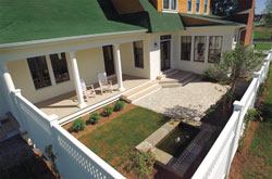 Inside, the first floor is organized around a courtyard that provides light and views for the master bedroom, living room, kitchen, and dining room. The rooms are well-proportioned and clearly defined but still offer a sense of openness, light, and flow. The second floor, which features two bedrooms, a sitting room, and a flex room, is meant for visiting friends and family.