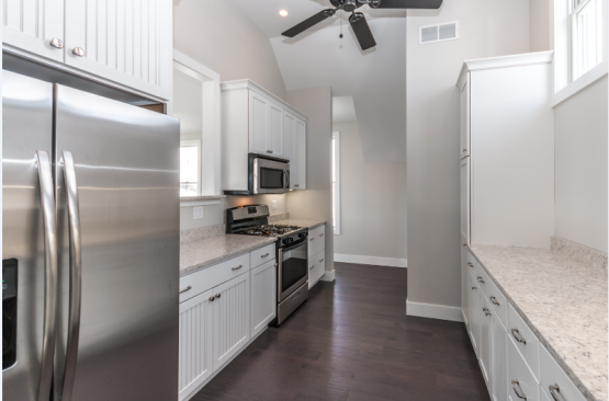 Priced at $284,500, the smaller of the two immediate-delivery cottages measures 950 square feet and has two bedrooms and 1½ baths. The first floor features combined living, dining and entertaining space open to the kitchen, which has direct access to a dining porch on the side of the home. Hardwood floors run throughout the first floor, and the kitchen is finished with gray-toned cabinetry, white granite countertops and stainless steel appliances.