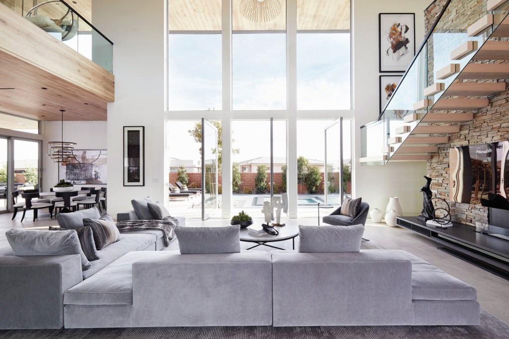 To create a home where owners can live in balance, U.S.-based architects at KTGY and Japanese architects from Sekisui House sketched separate plans for the house that overlooks the Red Rock Canyon to the west and the downtown Las Vegas skyline on the backside. From there, the team collaborated on those designs, and then the Sekisui House architects tweaked the final plan based on the structural needs for their unique prefabricated process.