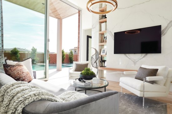 In the suite’s living room, another book-matched porcelain slab was used and expansive sliders give users access to outdoor living in the rear. “You can step out directly from the home suite outside to what feels like a private outdoor area,” says Ryan.